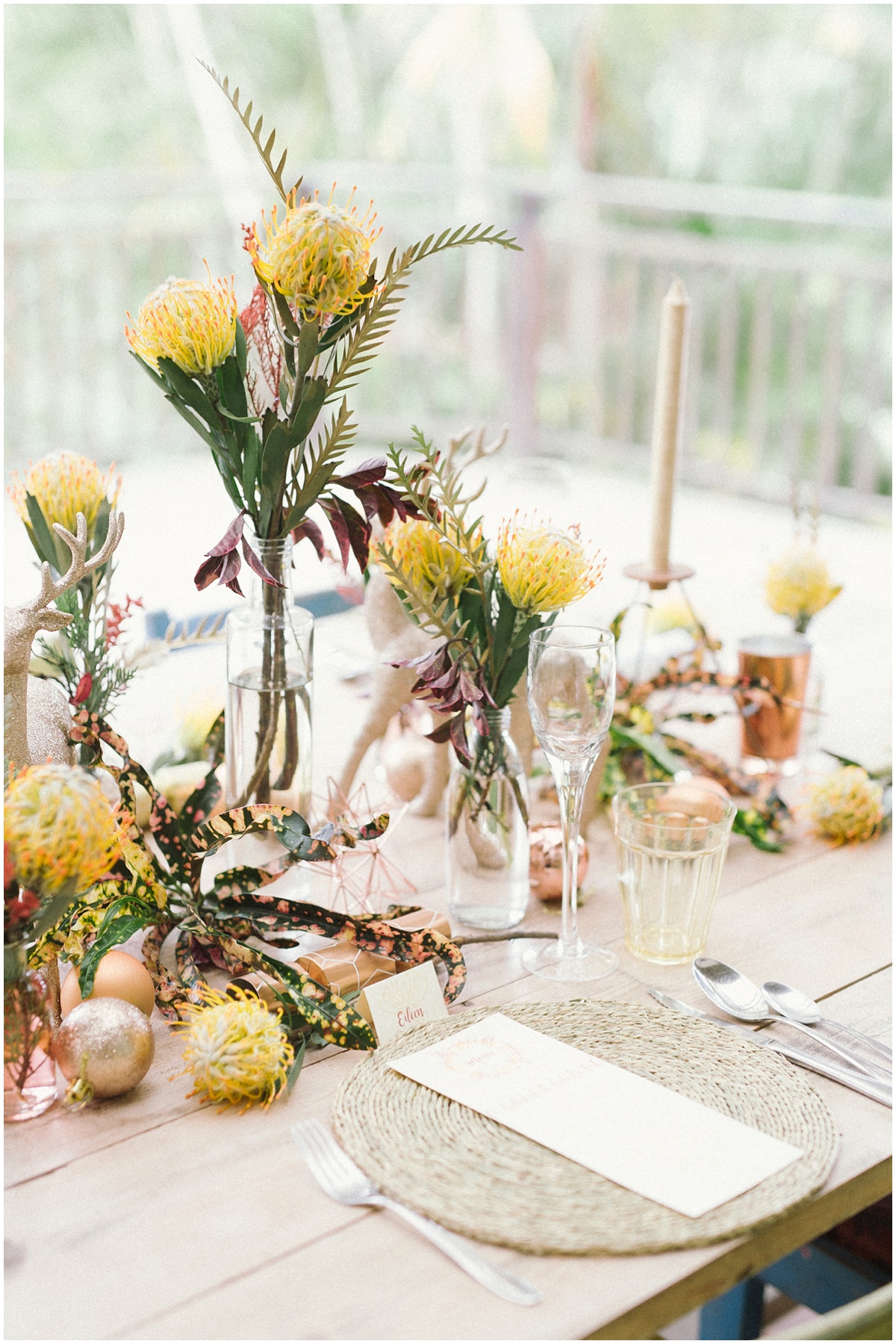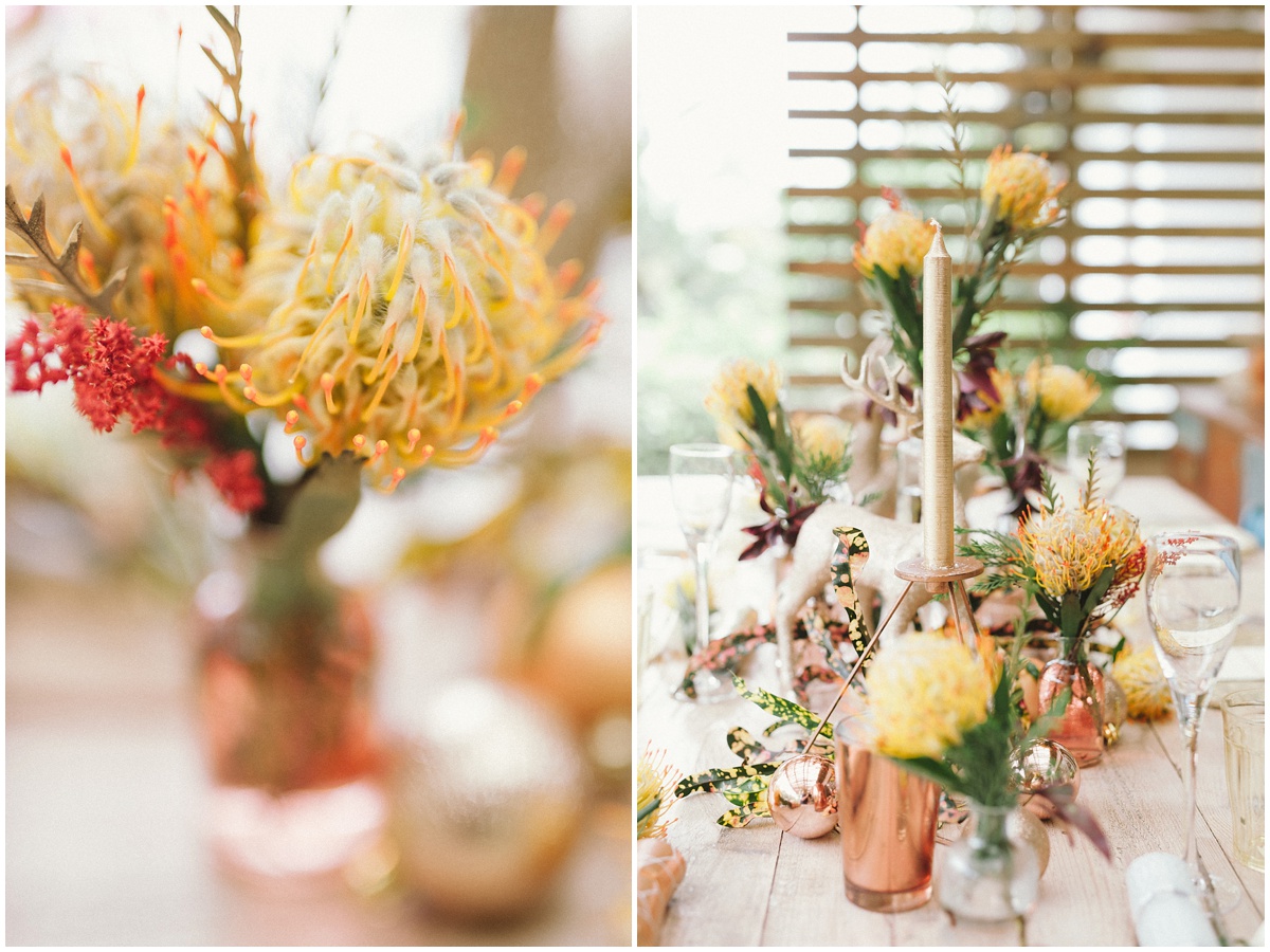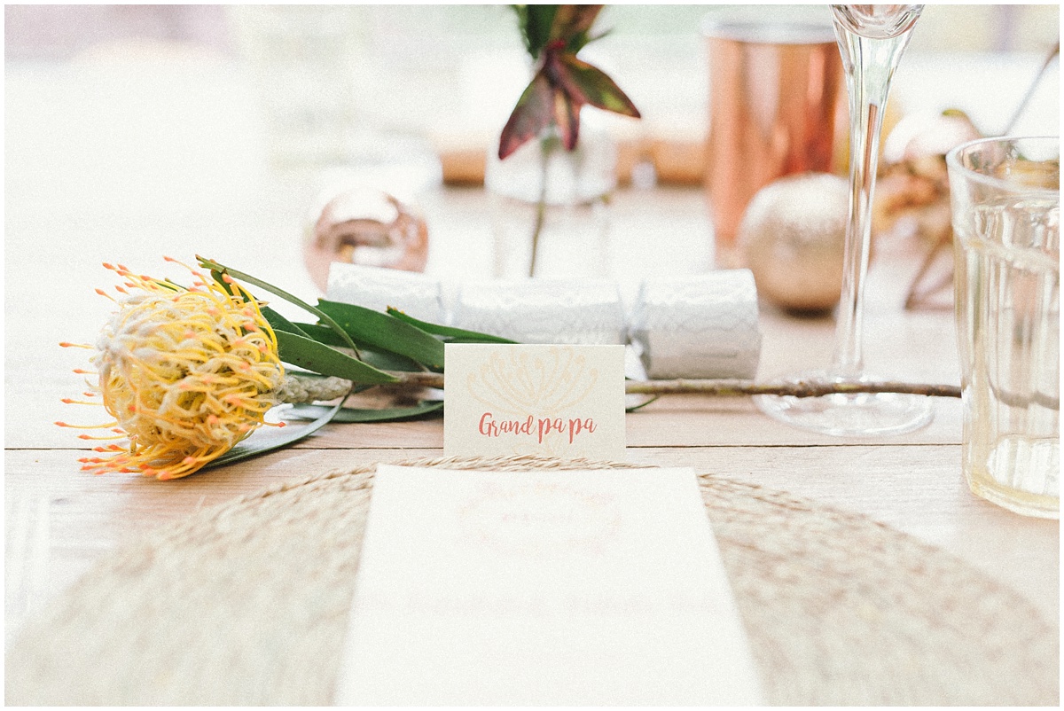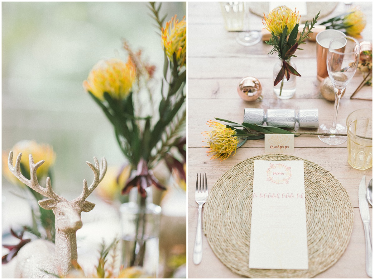 Being in the southern hemisphere, with heat and humidity, I often wonder what a “white Christmas” would be like. Snow flakes, hot chocolate, roasts, cold noses, snow fights and the like. Christmas in sunny South Africa means water fights, pool days, new costumes, cocktails and heat. I wanted my table to reflect what a hot Christmas in SA is actually like. A South African Christmas. Proteas, I love Proteas, but they are not in season during December, and I only discovered this after I had designed my protea wreath stationery to go with my South African Decor. With a little disappointment and a few phone calls to the local florists I managed to source some beautiful Pin cushion Proteas. I added my gold glittery reindeer, which I bought on Sale a few days after Christmas in 2015 from Wool worths, just to have some traditional reference to Christmas. I found some rose gold ballbeltjies (christmas balls) which I scattered down the centre of the table and borrowed some gorgeous grass place mats from The Basket Company and found some gold spray paint in the garage which I sprayed just the tips of some of the greenery, and it was done. Quick and easy. I created a little bit of height in the centre of the table and worked my way outwards, shortening the length of the stems and the different features of the decor. It really did not take me long to do and the stationery is available for download in our shop, so you can create your own Protea inspired Christmas in South Africa if you wish.