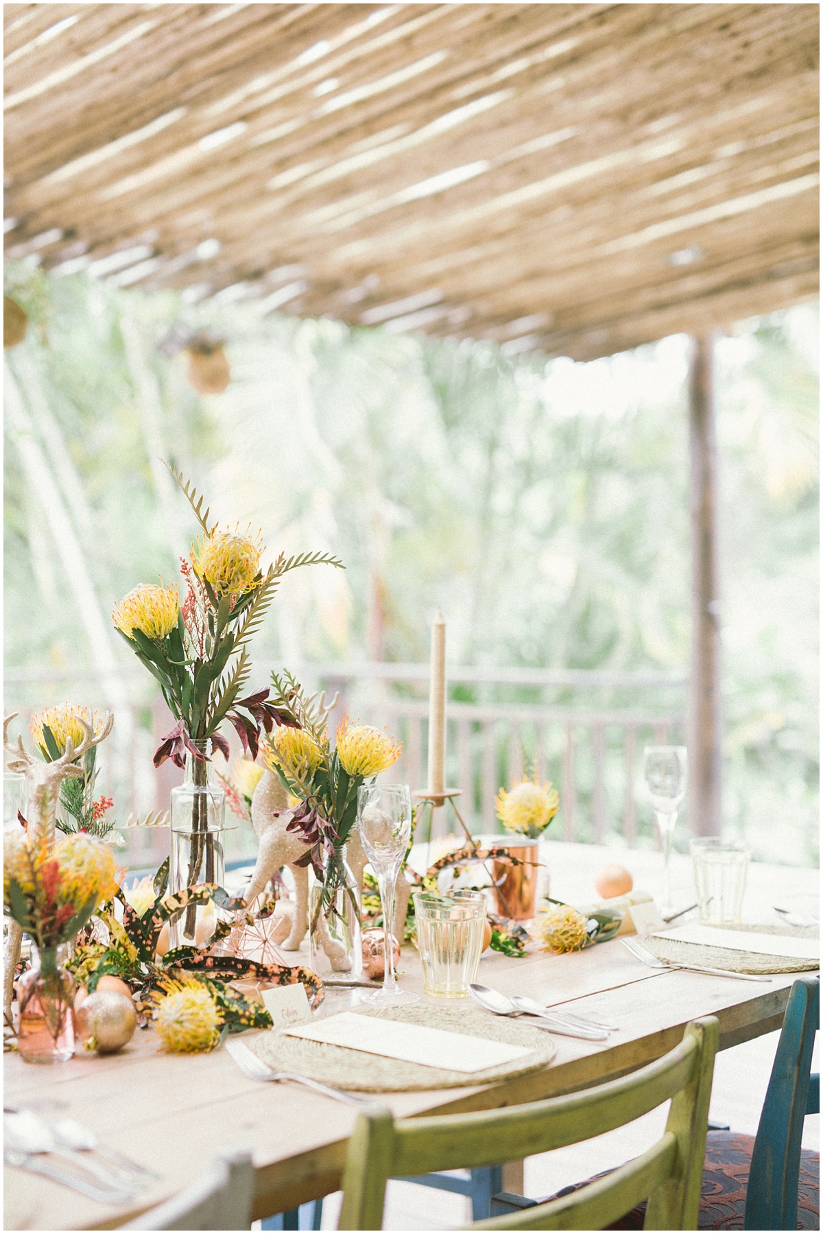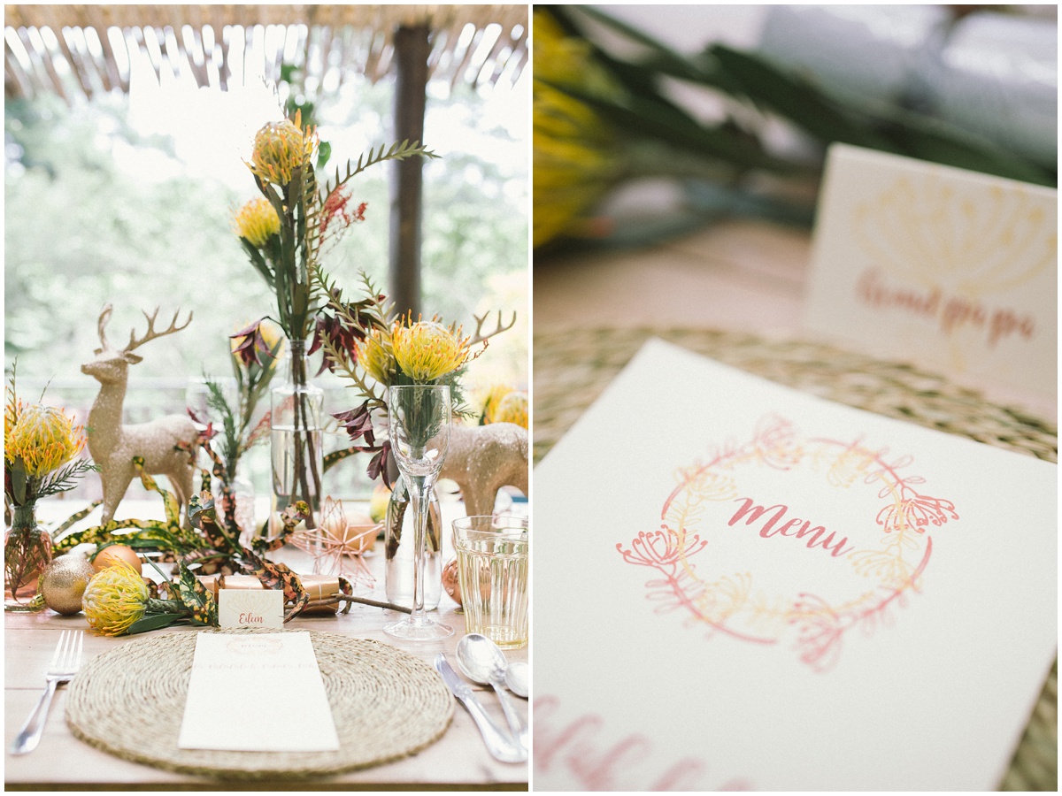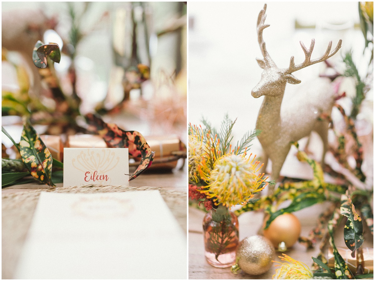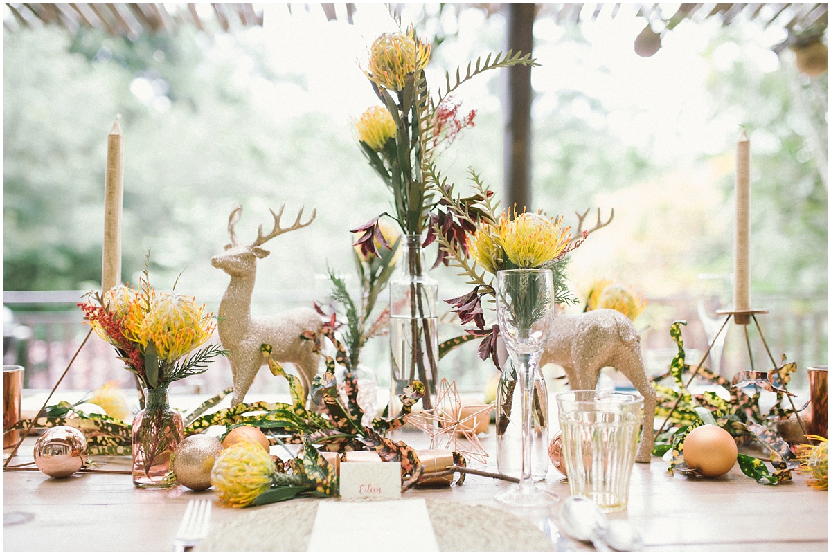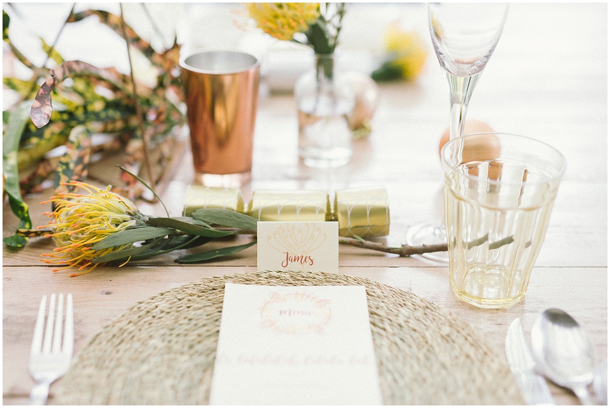 Being in the southern hemisphere, with heat and humidity, I often wonder what a “white Christmas” would be like. Snow flakes, hot chocolate, roasts, cold noses, snow fights and the like. Christmas in sunny South Africa means water fights, pool days, new costumes, cocktails and heat. I wanted my table to reflect what a hot Christmas in SA is actually like. A South African Christmas. Proteas, I love Proteas, but they are not in season during December, and I only discovered this after I had designed my protea wreath stationery to go with my South African Decor. With a little disappointment and a few phone calls to the local florists I managed to source some beautiful Pin cushion Proteas. I added my gold glittery reindeer, which I bought on Sale a few days after Christmas in 2015 from Wool worths, just to have some traditional reference to Christmas. I found some rose gold ballbeltjies (christmas balls) which I scattered down the centre of the table and borrowed some gorgeous grass place mats from The Basket Company and found some gold spray paint in the garage which I sprayed just the tips of some of the greenery, and it was done. Quick and easy. I created a little bit of height in the centre of the table and worked my way outwards, shortening the length of the stems and the different features of the decor. It really did not take me long to do and the stationery is available for download in our shop, so you can create your own Protea inspired Christmas in South Africa if you wish.