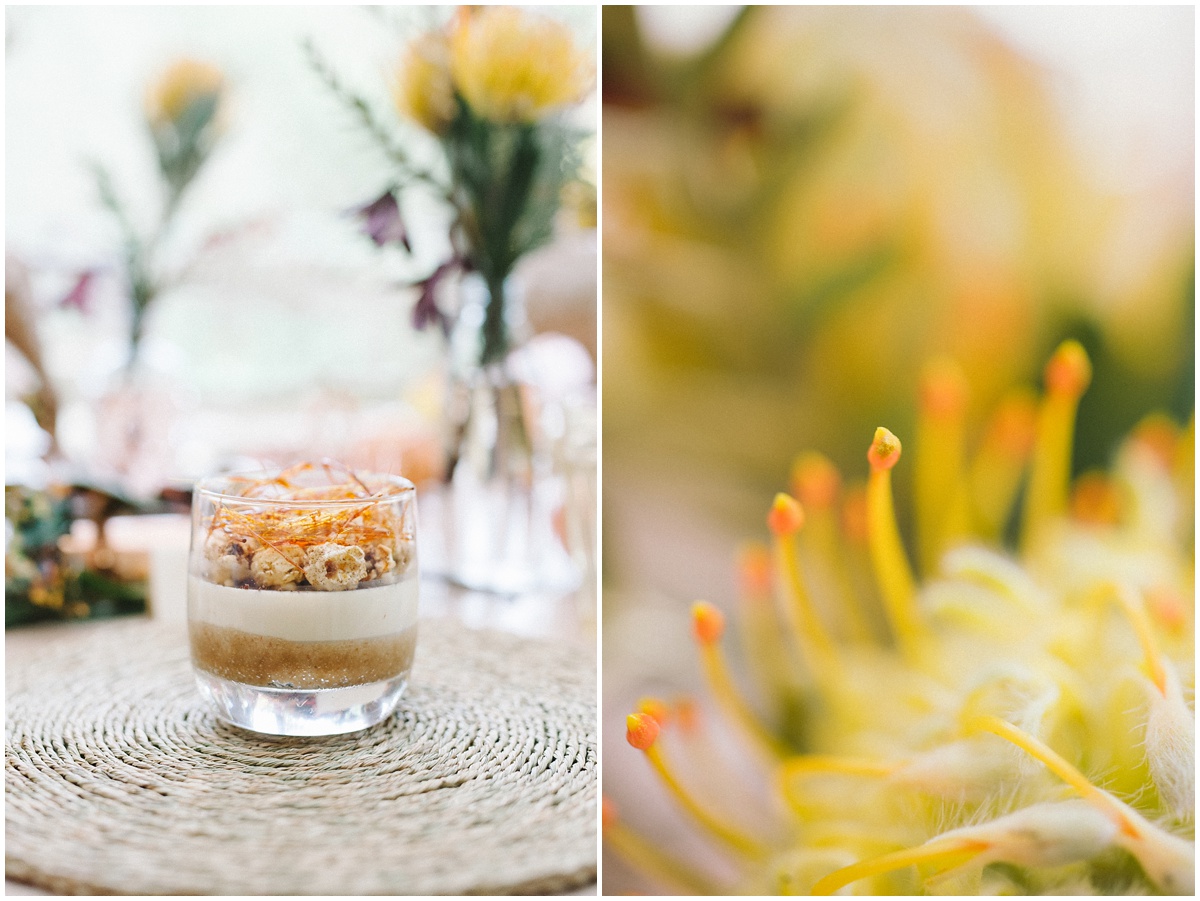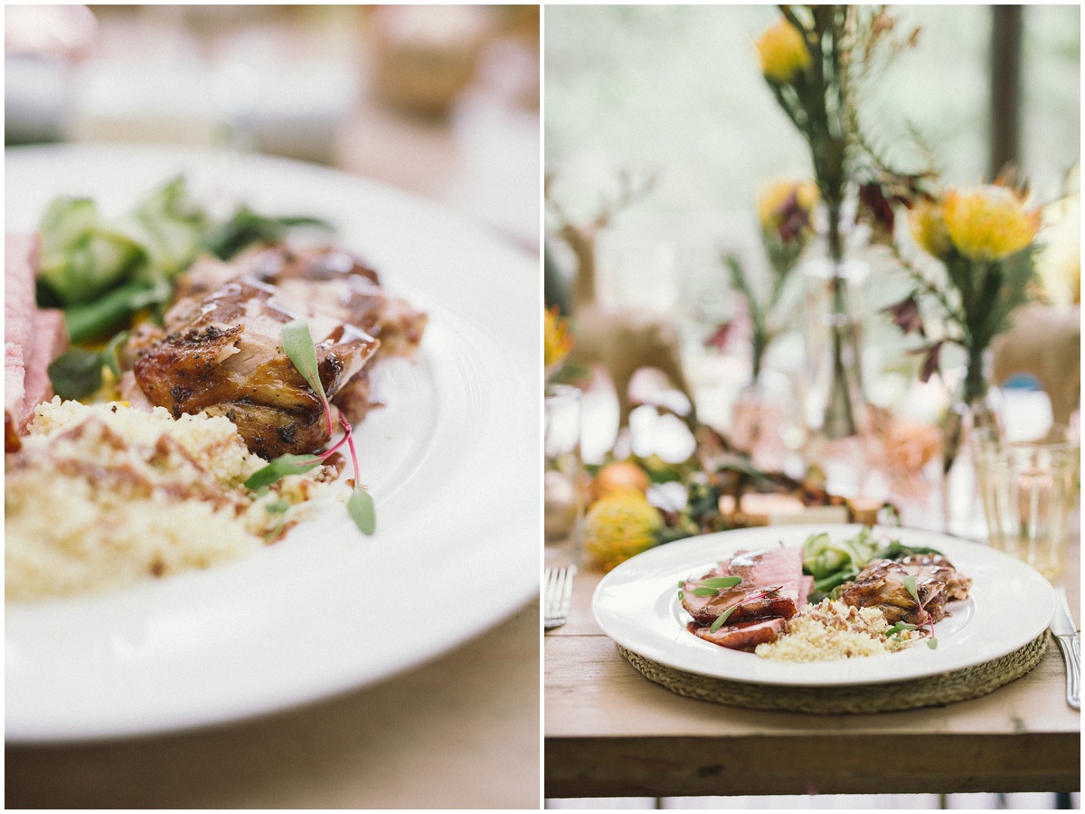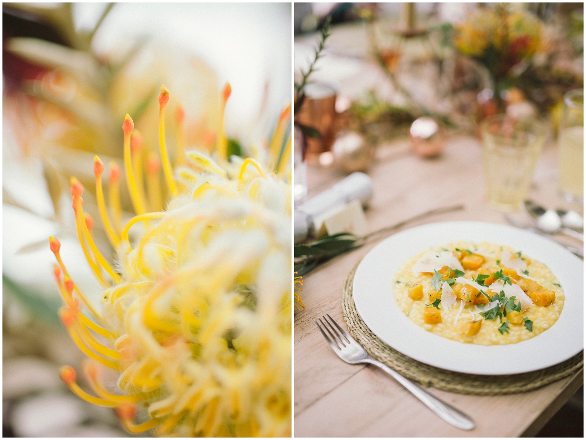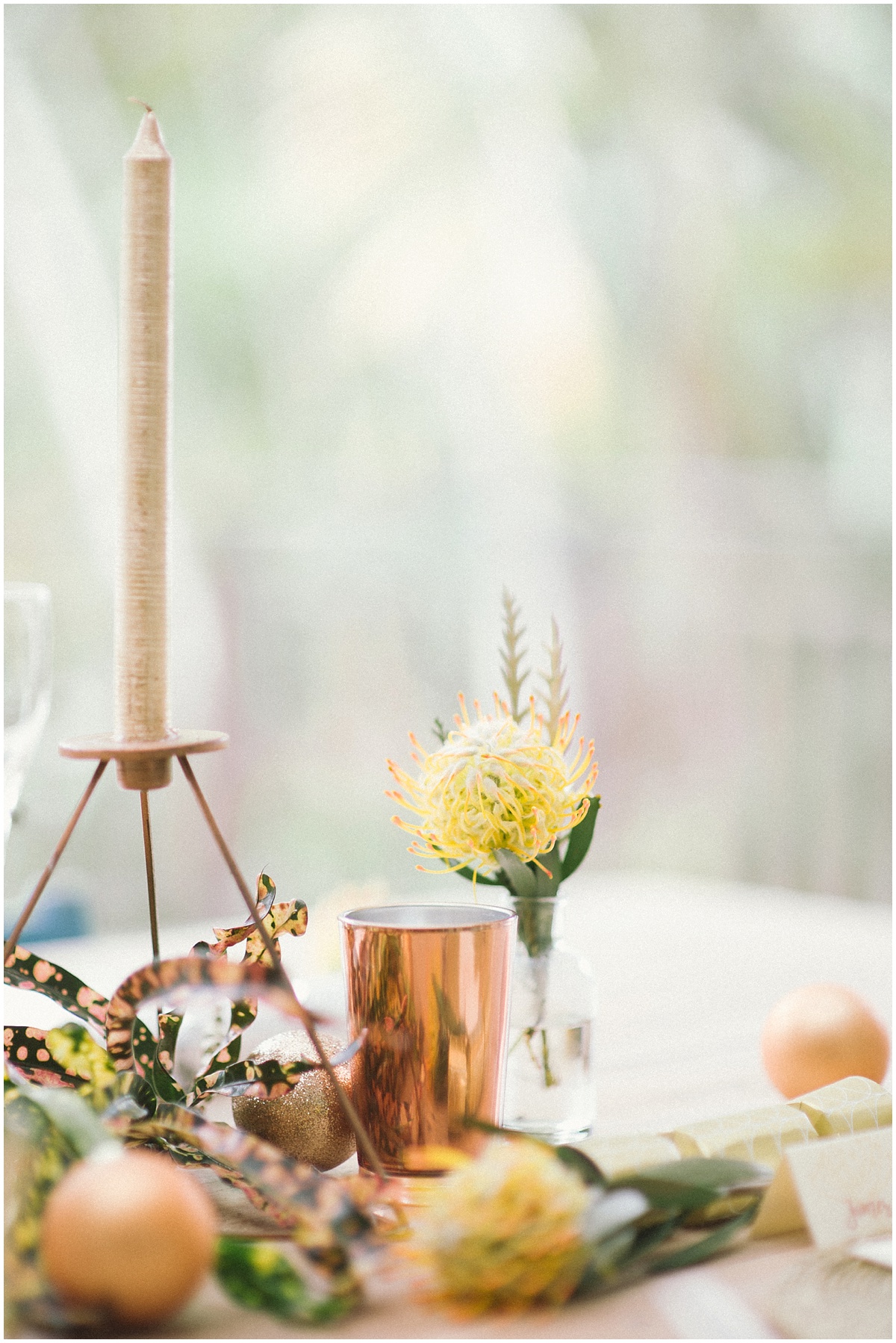 Being in the southern hemisphere, with heat and humidity, I often wonder what a “white Christmas” would be like. Snow flakes, hot chocolate, roasts, cold noses, snow fights and the like. Christmas in sunny South Africa means water fights, pool days, new costumes, cocktails and heat. I wanted my table to reflect what a hot Christmas in SA is actually like. A South African Christmas. Proteas, I love Proteas, but they are not in season during December, and I only discovered this after I had designed my protea wreath stationery to go with my South African Decor. With a little disappointment and a few phone calls to the local florists I managed to source some beautiful Pin cushion Proteas. I added my gold glittery reindeer, which I bought on Sale a few days after Christmas in 2015 from Wool worths, just to have some traditional reference to Christmas. I found some rose gold ballbeltjies (christmas balls) which I scattered down the centre of the table and borrowed some gorgeous grass place mats from The Basket Company and found some gold spray paint in the garage which I sprayed just the tips of some of the greenery, and it was done. Quick and easy. I created a little bit of height in the centre of the table and worked my way outwards, shortening the length of the stems and the different features of the decor. It really did not take me long to do and the stationery is available for download in our shop, so you can create your own Protea inspired Christmas in South Africa if you wish.
